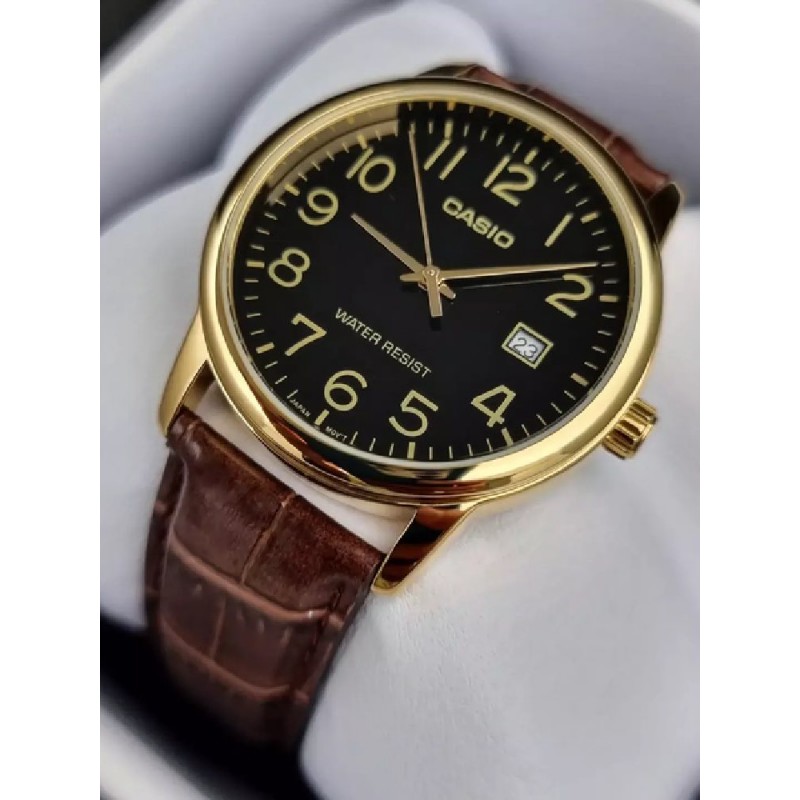 Casio MTP-V002GL-1B — це елегантні чоловічі годинники, які поєднують класичний дизайн та сучасні елементи. Корпус із нержавіючої сталі із золотистим іонним покриттям додає моделі розкішного вигляду, а чорний циферблат із витонченими мітками та стрілками створює гармонійний контраст. На позначці «3 години» розташоване віконце дати, що робить використання годинника ще зручнішим.