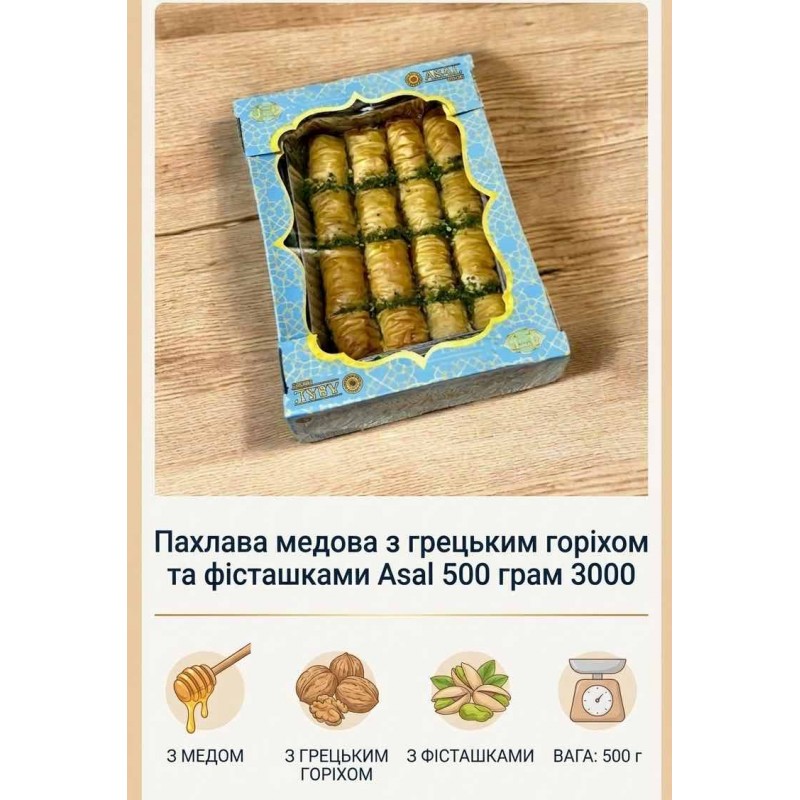 Пахлава медова з волоським горіхом та фісташками ПМ-5 Asal 500 г