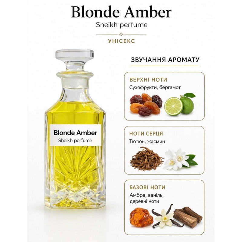 Теги: Blonde Amber,масляний парфум,унісекс аромат,східні духи,амбра ваніль,Sheikh perfume