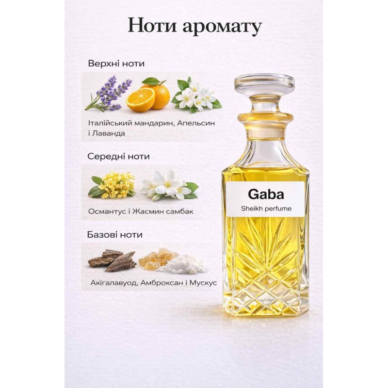 Gaba — сучасний аромат із яскравим цитрусово-деревним характером та м’якими мускусними відтінками. Композиція поєднує свіжі цитрусові акорди, ароматичні ноти лаванди та благородні деревні відтінки, створюючи стильне й привабливе звучання. Аромат розкривається поступово, залишаючи гармонійний та елегантний шлейф.