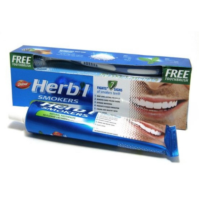Профилактическая зубная паста Dabur Herbal smokers Natural в комплекте с зубной щеткой без фтора, не содержит вредных химических веществ. Уникальная формула зубной пасты Dabur Herbal smokers Natural для курильщиков рекомендуется для ежедневного использования. Она эффективно удаляет чайный, кофейный и табачный налет и пятна делая зубы белее и ярче.